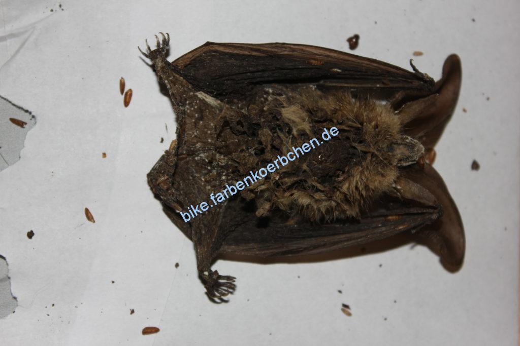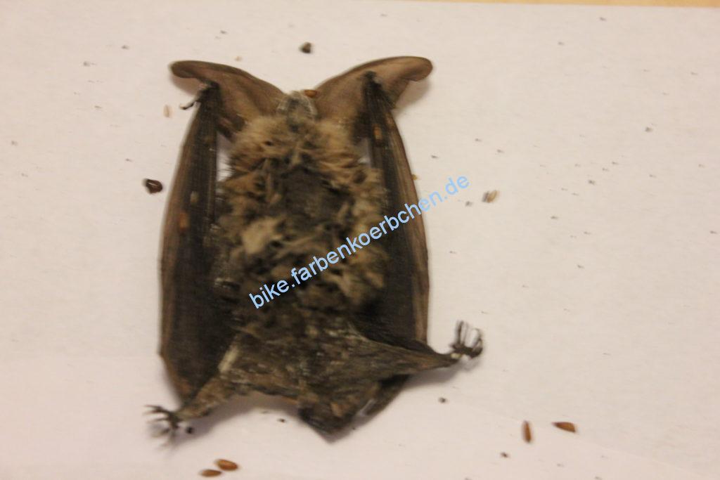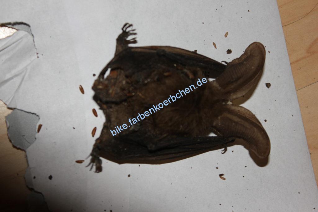 bei der Reparatur einer Lampe im Keller ist mir doch tatsächlich eine tote Fledermaus begegnet, sie hatte sich in der Lampe versteckt und wohl keinen Weg nach draußen gefunden, schade um das Tier, aber die Bestätigung meiner Vermutung. Vor einigen Jahren hatte ich schonmal was flatterndes im Keller gesehen und eine Fledermaus vermutet. hier die Pics vom toten Tier.